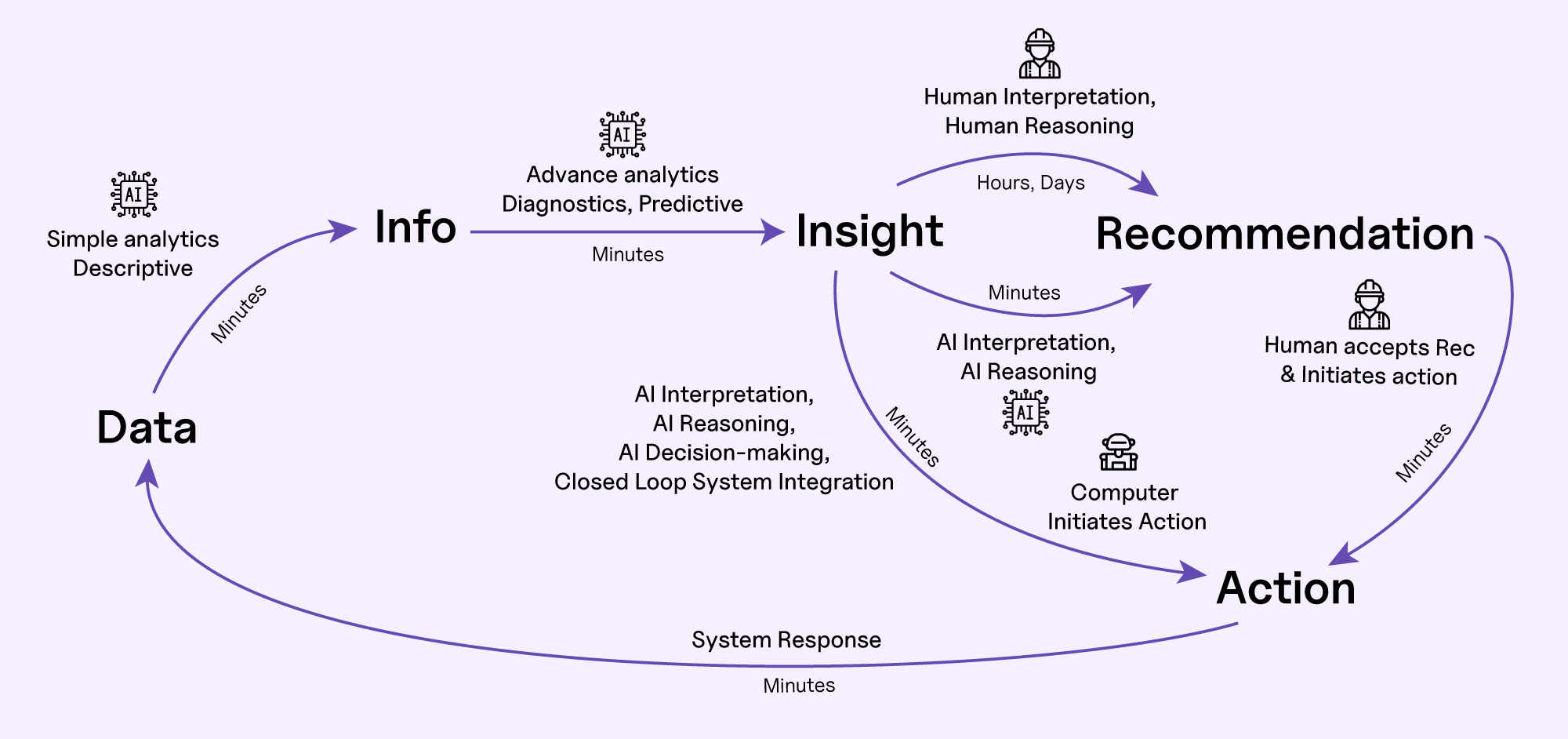 Advanced analytics like predictive and diagnostic analytics turn information to insights, telling you what is going to happen, sometimes even why and when it will happen. Insights stop just short of telling you what you should do about it. Automation of this step has become more common in the past decade and occurs on the scale of minutes for many use cases. -